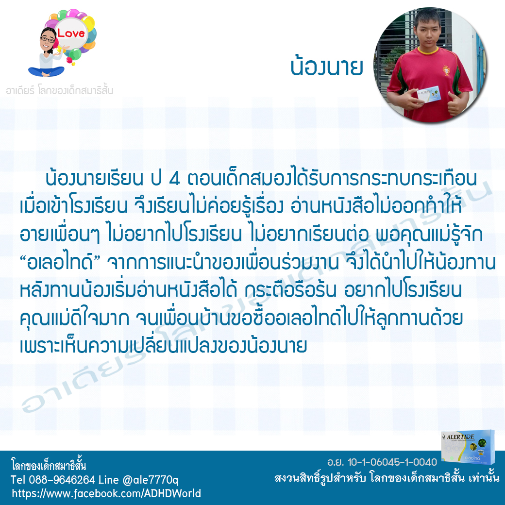 จำหน่ายผลิตภัณฑ์ "อเลอไทด์" สารอาหารบำรุงสมอง โทร 088 9646264 อาเดียร์ . 💡อเลอไทด์ (Alertide) อาหารบำรุงสมอง ในภาวะที่สมองมีปัญหา ใยสมองไม่แข็งแรงก่อให้เกิดอาการขาดสมาธิ สมาธิสั้น ขี้ลืม . 🔰เราควรจะบำรุงสมองของเด็กโดยให้อาหารสมองเพื่อบำรุงให้สมองกับมาทำงานได้อย่างปกติและมีประสิทธิภาพมากขึ้น . ✔️อาหารบำรุงสมองจะไม่เกิดผลข้างเคียงเพราะไม่ใช่สารเคมี ✔️ไม่มีการสะสมในร่างกายเหมือนสารเคมี ✔️ อาหารเสริมจะทำให้สมองของเด็กได้รับการบำรุงจนทำให้ใยสมองที่อ่อนแอกลับมาแข็งแรงขึ้นจนเป็นปกติ . 🌱สำหรับ อเลอไทด์ ไม่ใช่ยา ไม่ได้ออกฤทธิ์ทันทีเหมือนยา 🌲เป็นสารอาหารจากธรรมชาติ จะไม่มีผลข้างเคียงใดๆ 🌿เมื่อมีอาการดีขึ้นแล้วจะดีแบบระยะยาว. . สนับสนุนโดย อเลอไทด์ ผลิตภัณฑ์เสริมอาหารบำรุงสมองและระบบประสาท ด้วยความปรารถนาดี #โลกของเด็กสมาธิสั้น . 👩⚕️ลูกเรียนไม่ทันเพื่อน พ่อแม่ ไม่ควรมองข้าม 👩⚕️สาเหตุ ของการที่เด็กเรียนไม่ทันเพื่อน . ⏩เด็กมีสติปัญญาบกพร่อง ⏩เด็กมีโรคสมาธิสั้น ⏩เด็กที่มีผลการเรียนดีมาตลอดแต่ผลการเรียนตก ⏩เด็กที่มีภาวะวิตกหรือเป็นโรคซึมเศร้า ⏩ภาวะทางการเรียนที่เพิ่มสูงขึ้น ⏩เด็กกับสื่ออิเล็กทรอนิกส์ การใช้มือถือเป็นเวลานาน . 👩⚕️เพิ่มพลังสมอง เรียนอะไรก็จำแม่น ไอคิวสูง อีคิวเยี่ยม 👩⚕️การได้รับสารอาหารสำหรับสมองที่ถูกต้อง ก็จะช่วยส่งเสริมพัฒนาการสมองลูกได้ค่ะ . 👩⚕️ ติดต่อสอบถามผลิตภัณฑ์ อเลอไทด์ ☎️088 964 6264 อาเดียร์ . 👩💻 ทักแชทไลน์ 👇👇 @ale7770q